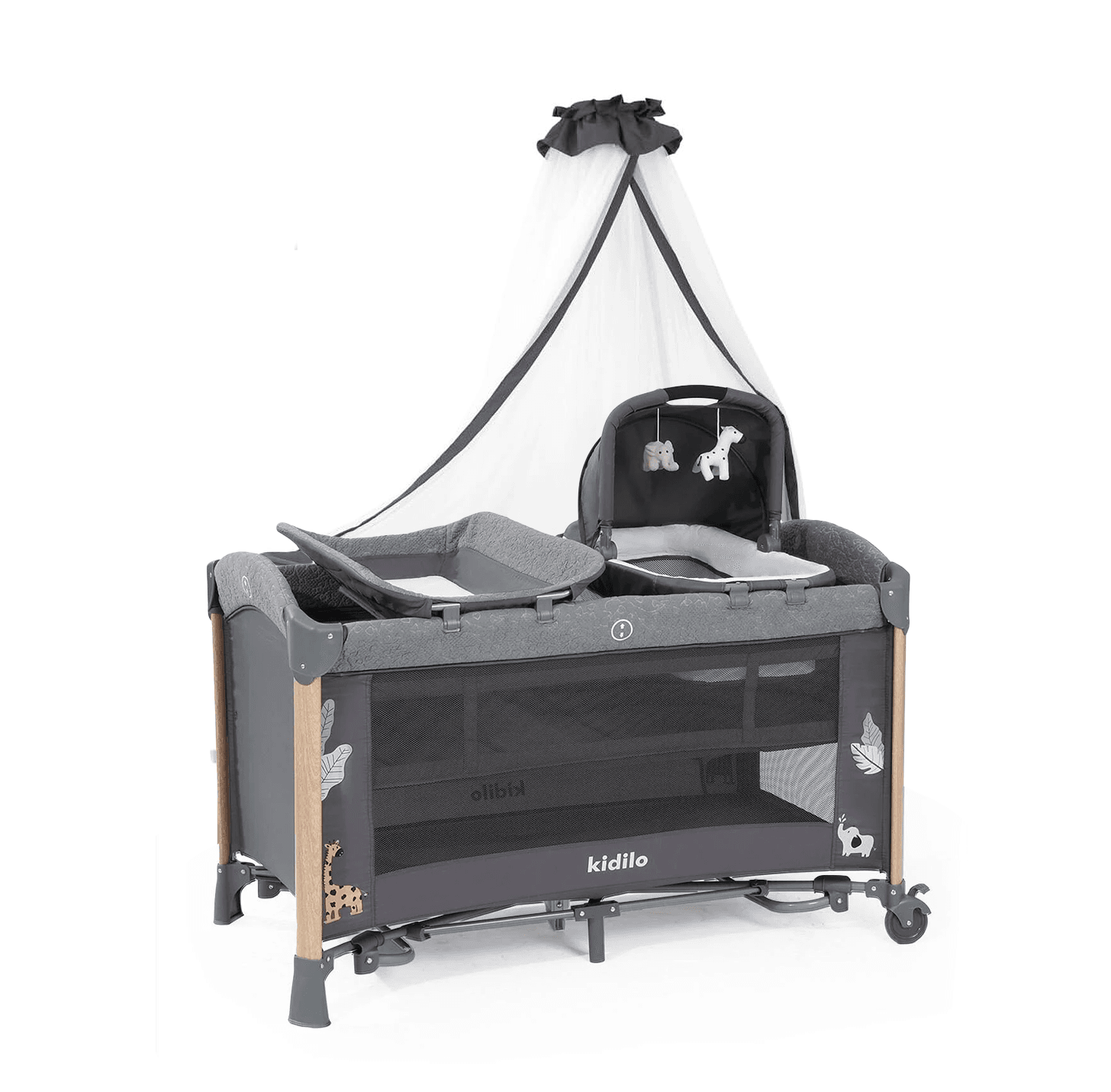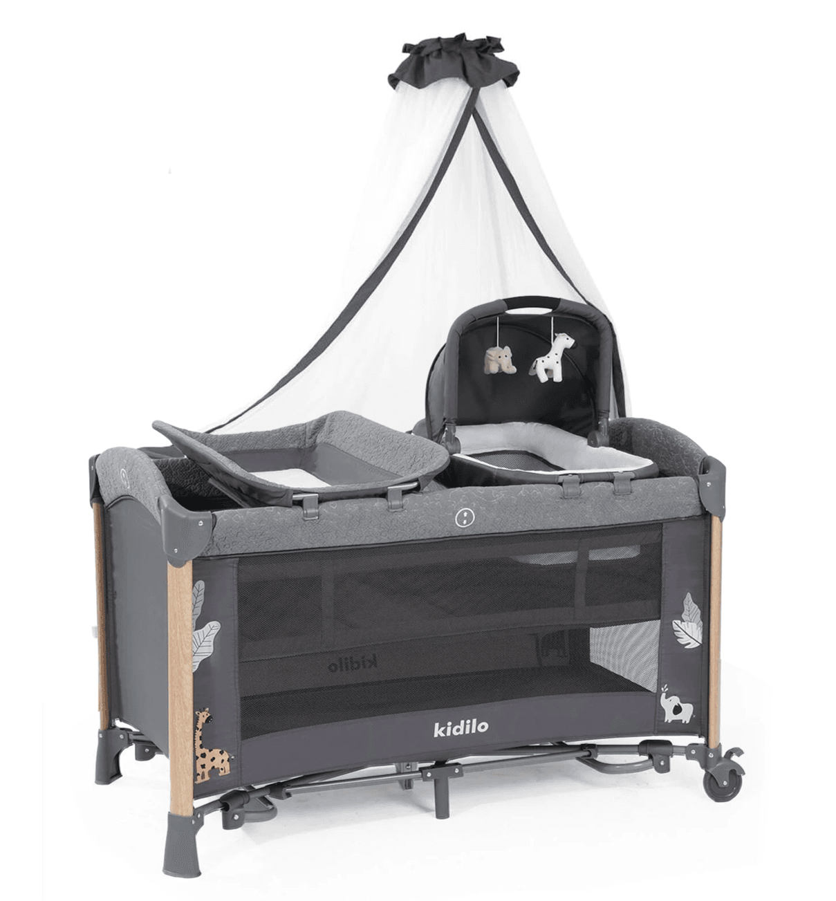 Berceau bébé Kidilo gris au design moderne et multifonctionnel. Réglable, sécurisé et confortable, idéal pour le cododo et le sommeil de bébé dès la naissance.